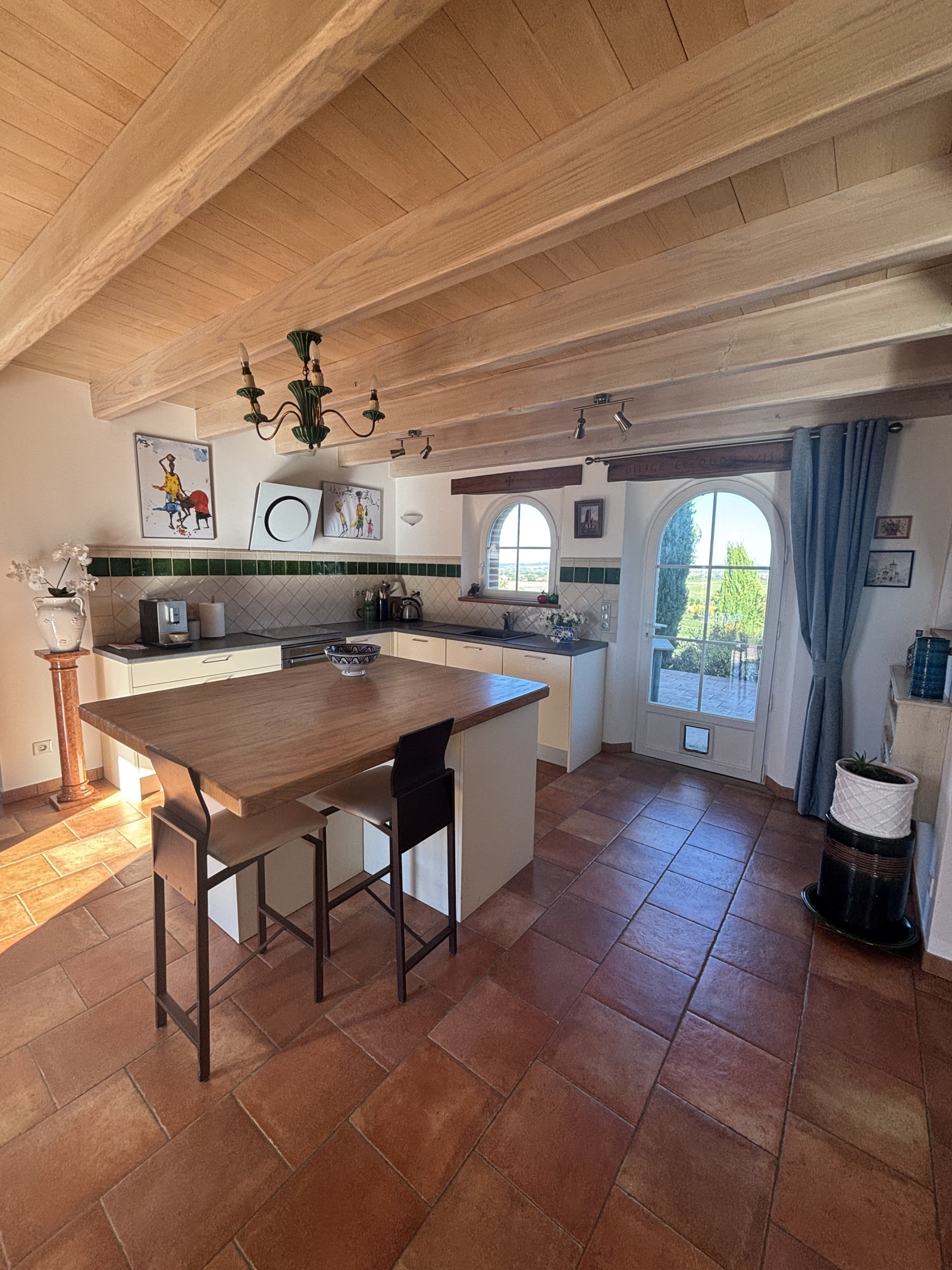 Dès l’entrée, vous profitez d’un superbe espace de vie avec plafond cathédrale, cheminée avec insert et cuisine ouverte, l’ensemble donnant directement sur une terrasse.