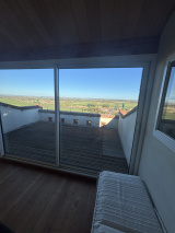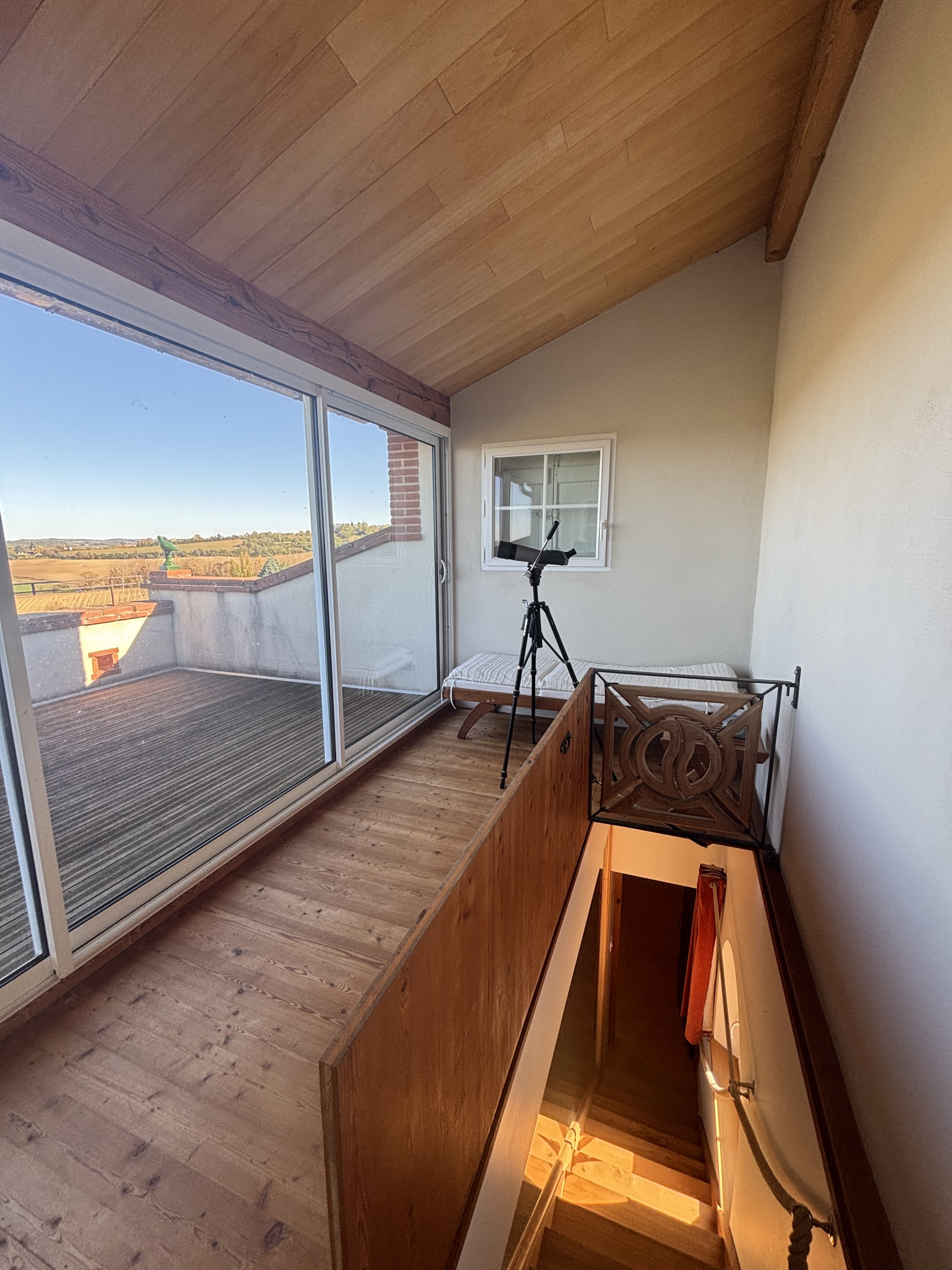 Un escalier en colimaçon mène à la mezzanine puis à une chambre supplémentaire, avant d’accéder à un espace unique : un observatoire prolongé d’une terrasse avec vue panoramique sur la campagne environnante.
