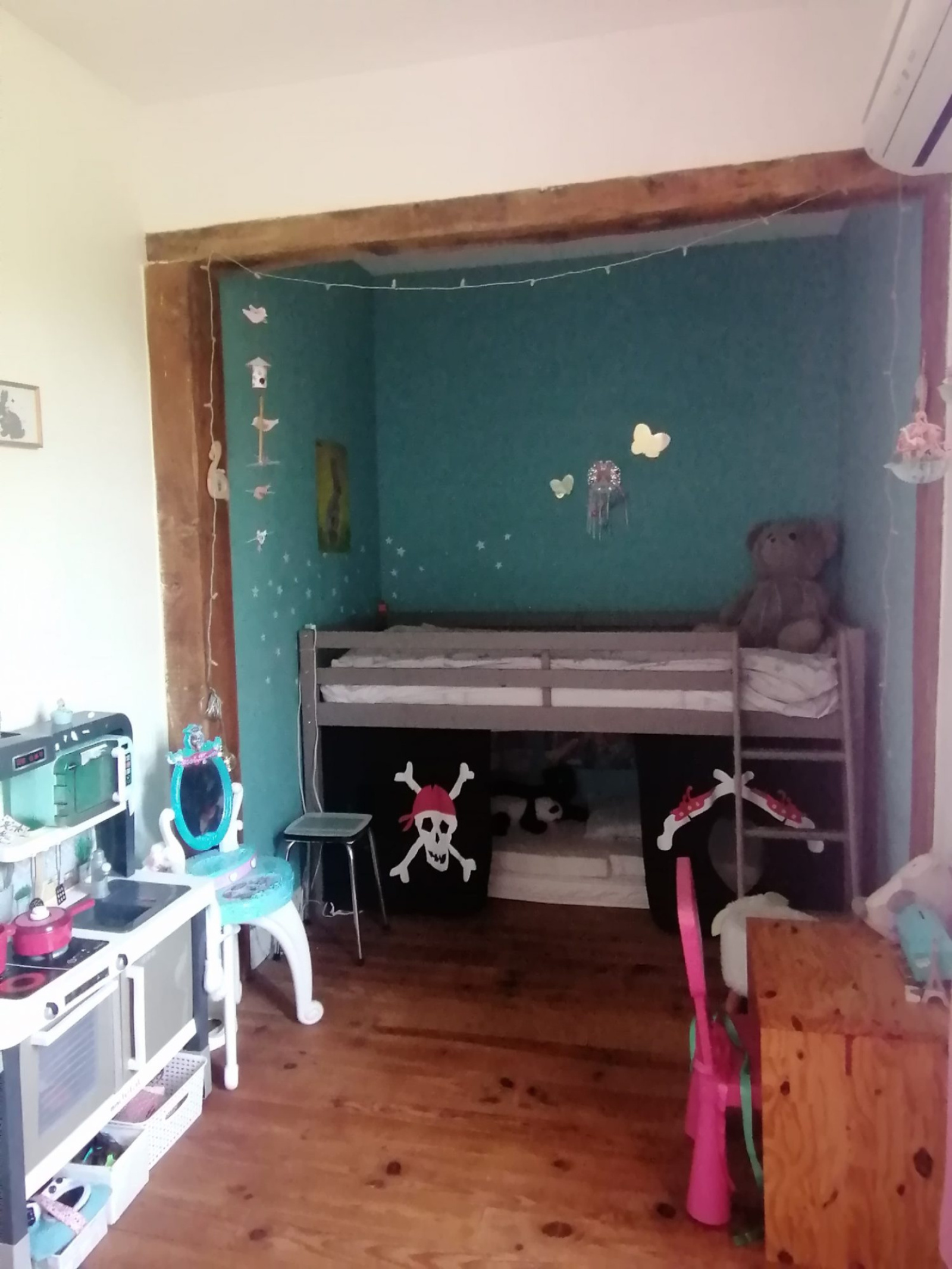 À l’étage : trois chambres lumineuses, dont une avec sa propre salle de bains et WC, ainsi qu’une salle d’eau familiale.