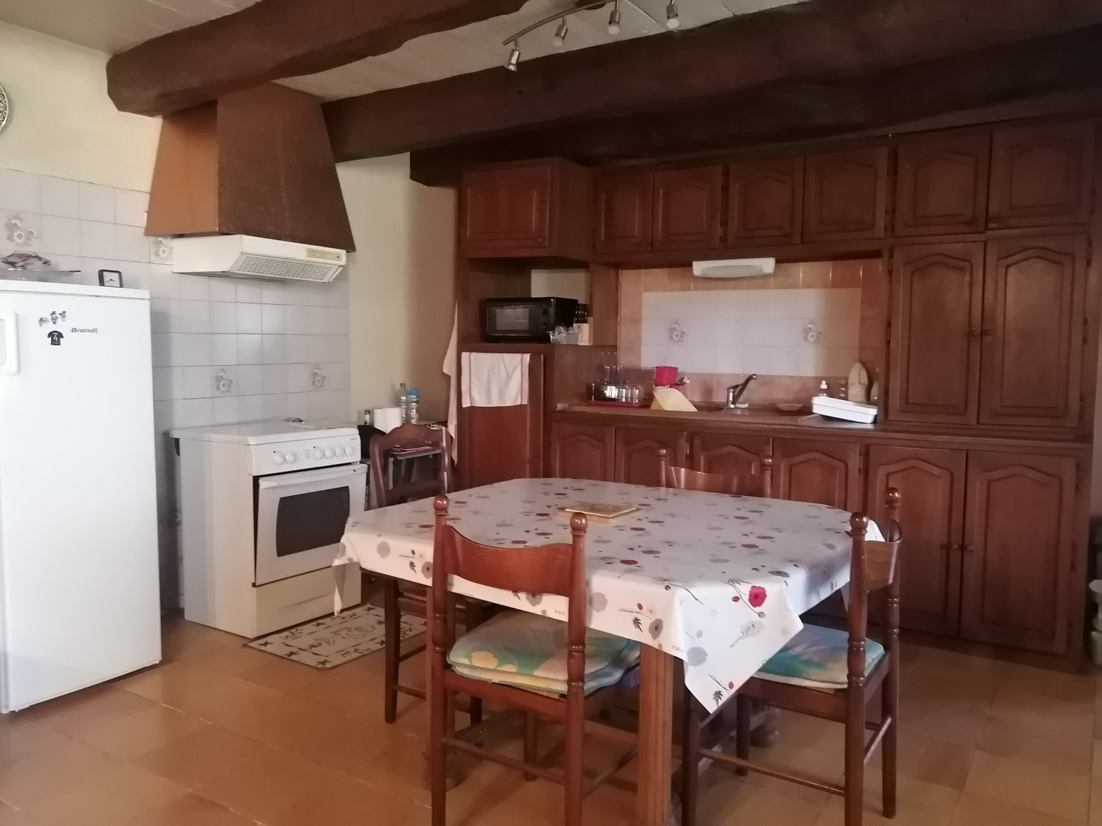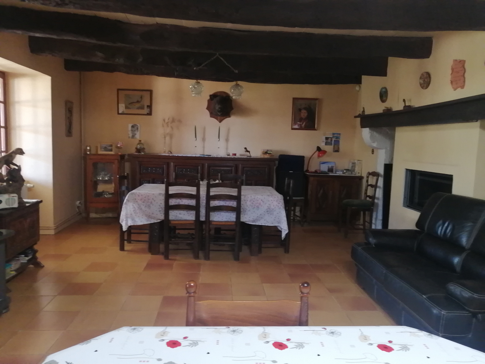 La maison, d’une surface habitable d’environ 142 m², se compose au rez-de-chaussée d’un séjour avec poutres apparentes et cuisine ouverte, agrémenté d’une magnifique cheminée avec insert, d’une véranda lumineuse, ainsi que d’une salle d’eau et d’un WC à l’entrée.